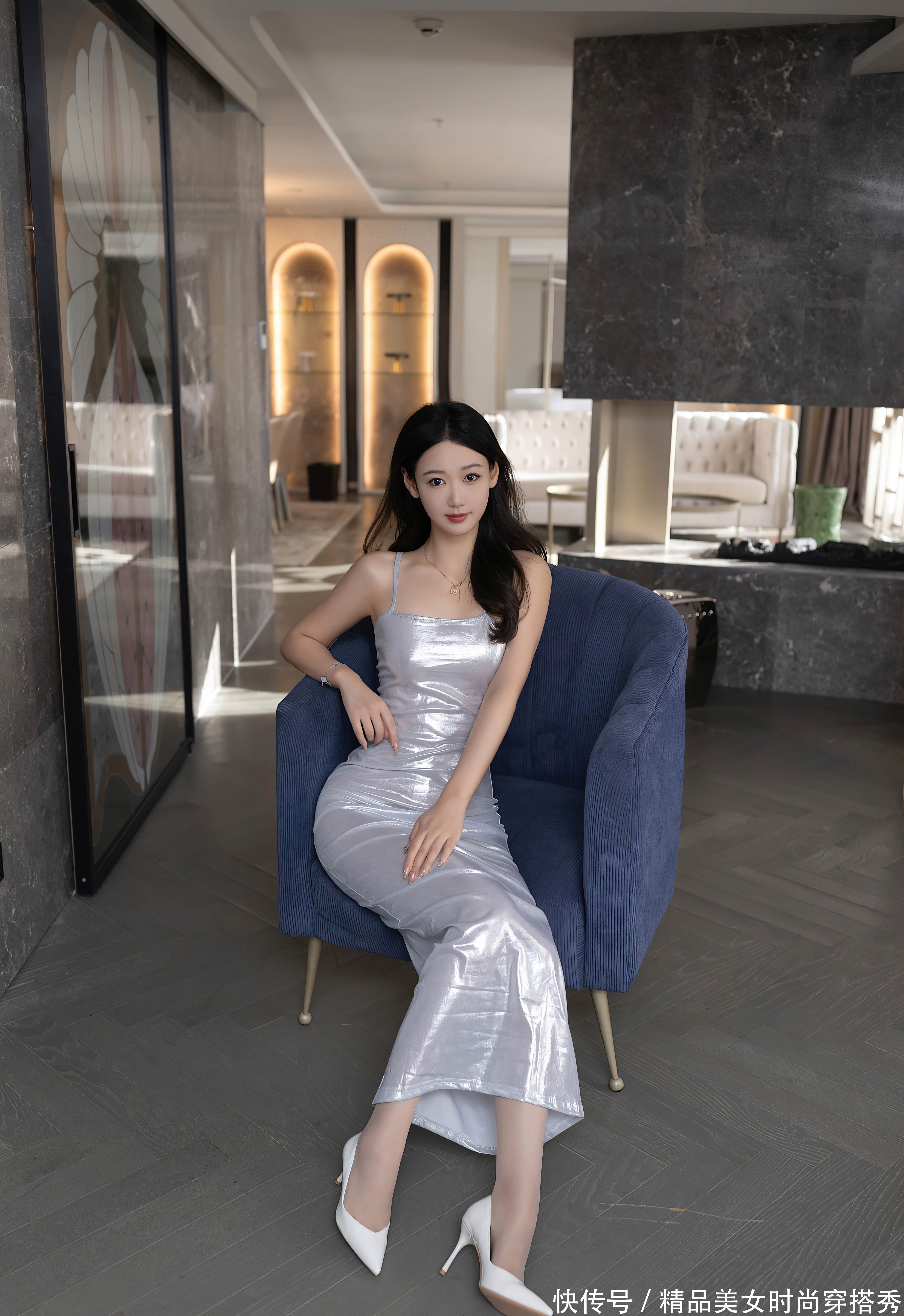 这袭长裙贴合她的身形,勾勒出曼妙的曲线,银色的光泽在灯光下熠熠生辉,仿佛为她披上了一层神秘的面纱。